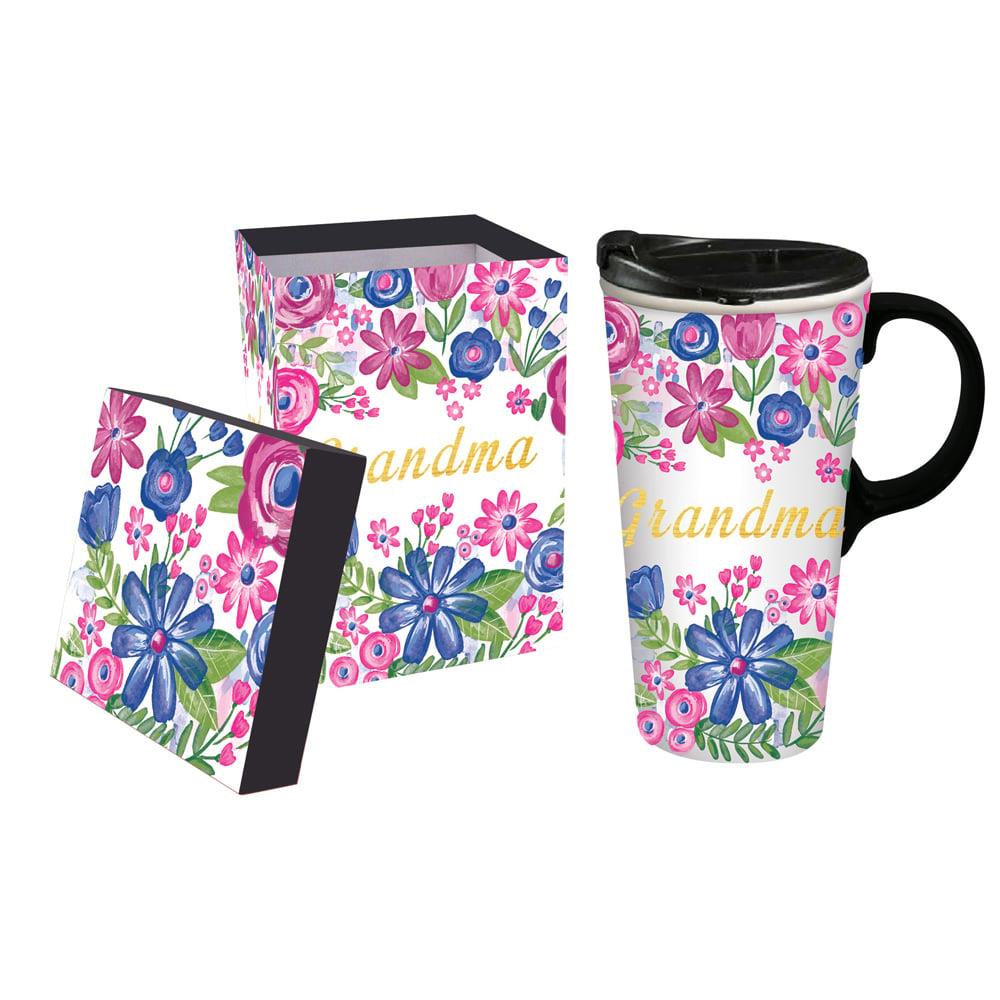 Perfect for an on-the-go lifestyle, this travel cup is a top seller and fan favorite. Crafted from durable ceramic, the mug is covered in charming floral artwork and embossed with the word "Grandma" in gold lettering. It holds up to 17 ounces of your favorite coffee or tea and has a three-ring silicone lid that fits perfectly into the cup's molded grooves for added security. For quick cleaning purposes, it's top-rack dishwasher safe. Due to its metallic accents, it cannot be microwaved. The cup comes packaged in a beautiful coordinating gift box, making it a thoughtful and perfect present.