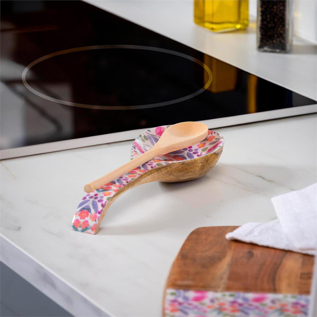 Elevate your kitchen aesthetics with the Petal Paradise Wood Spoon Rest. Measuring 10.25 inches in length, this spoon rest combines functionality with floral elegance. Made from durable wood, its vibrant floral pattern adds a touch of springtime charm to your countertop. Perfect for keeping your cooking area tidy, it accommodates spoons of various sizes while protecting surfaces from drips and stains. The gently curved design ensures stability and easy handling, making it a delightful addition to any culinary space.
