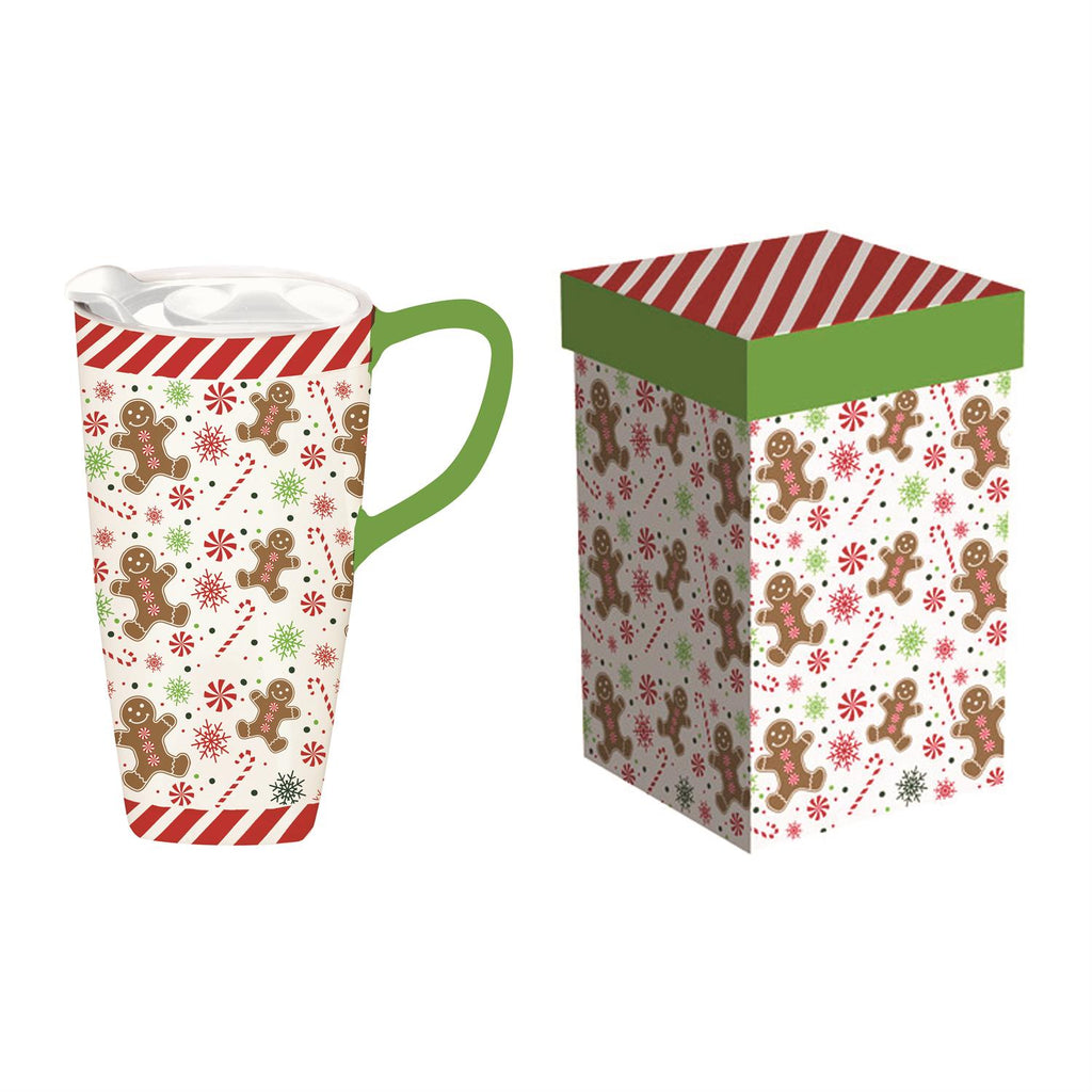 Celebrate the holiday spirit on the go with this charming Ceramic Travel Cup. Holding up to 17 oz., this cup is perfect for your favorite hot beverages during the festive season. Its delightful gingerbread and candy cane design captures the essence of Christmas traditions, making it a perfect gift or personal treat. The travel cup comes with a matching box, ideal for gifting. Its sturdy ceramic construction ensures durability and a comfortable grip, while the secure lid prevents spills, making it a practical choice for everyday use.