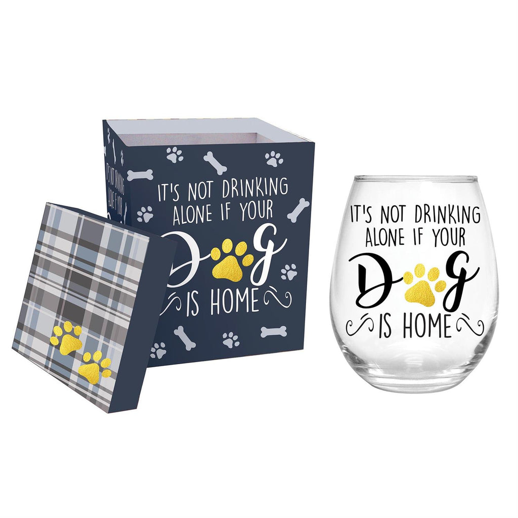 Woof! Dog moms and dads, raise your glass and celebrate your favorite pup. This sassy and chic drinkware design features the phrase "It's Not Drinking Alone if Your Dog is Home" in black script with a metallic gold paw print. Featuring a generous 20-ounce capability and crafted from high-quality glass, the stemless vessel should be hand washed to ensure longevity. Scoop the wine glass up for yourself or give it to any animal lover in your life; it even comes in a coordinating decorative gift box, making it the perfect present!