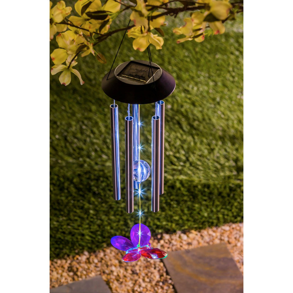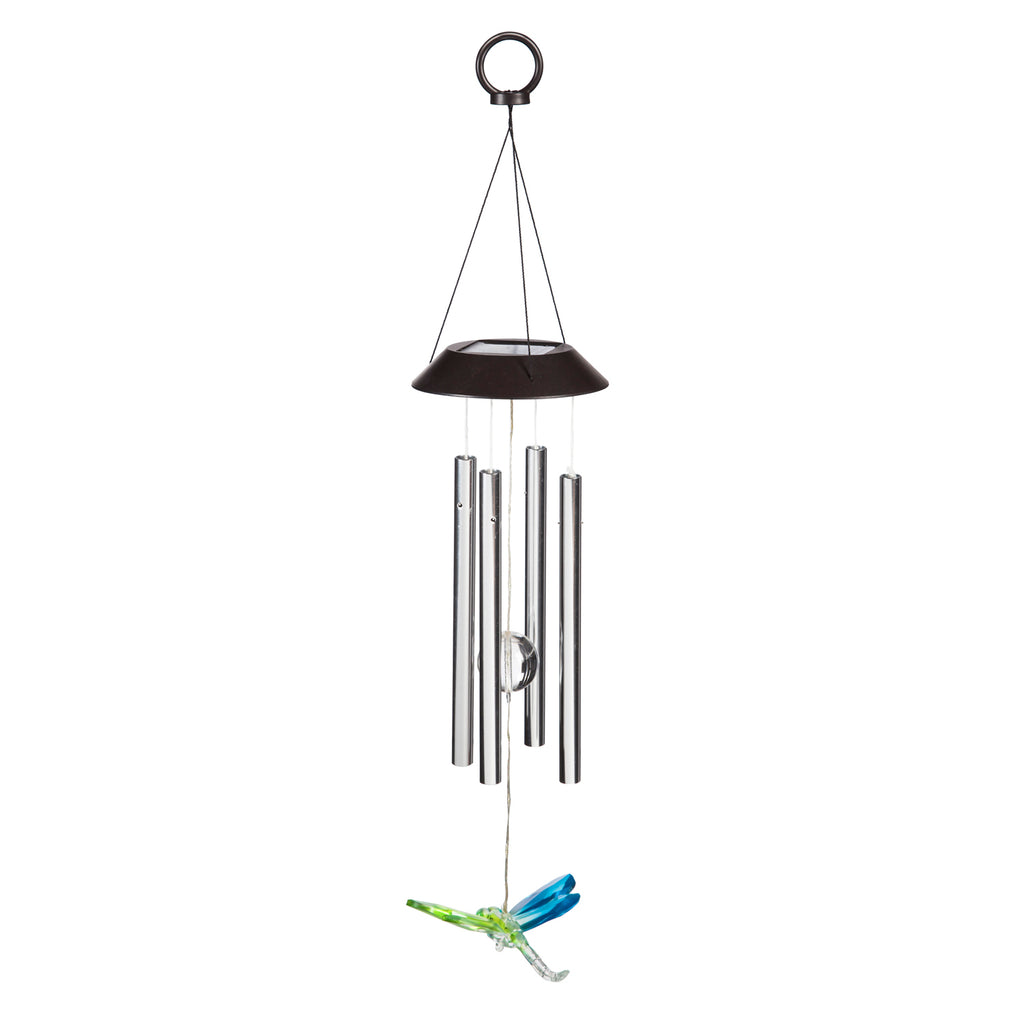 Bring your garden to life with our set of 3 Dragonfly, Hummingbird, and Butterfly solar metal and plastic wind chimes. The pieces will emit a beautiful melody with each breeze that passes through your yard, and they even illuminate at night. Their embedde