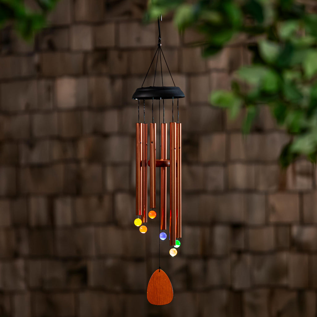 Enhance your garden with this elegant 33-inch bronze voice-activated solar wind chime, perfect for creating a serene outdoor atmosphere. Powered by solar energy, it offers captivating sounds and light as it sways in the breeze.