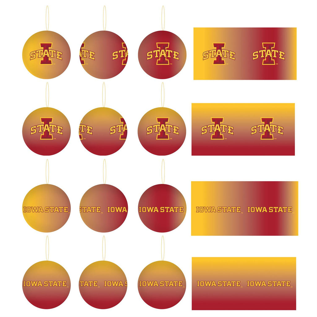 Celebrate the holiday season with pride using this 12-piece Iowa State Ornament Set. Perfect for adding a touch of collegiate spirit to your Christmas tree, these ornaments feature the iconic Iowa State colors and logo. Each ornament is crafted with durable materials and designed with a glossy finish, making them a festive addition to any home. With a convenient size, they are easy to hang and will enhance your seasonal décor with their vibrant presence. Whether you're an alumni or a fan, these ornaments are a must-have for showcasing your school spirit.