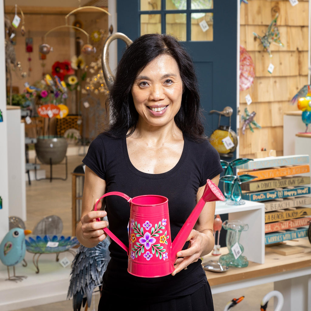 Enhance your garden with this charming hand-painted metal watering can, available in an assortment of three vibrant colors. Perfect for everyday use, these cans combine functionality and style.
