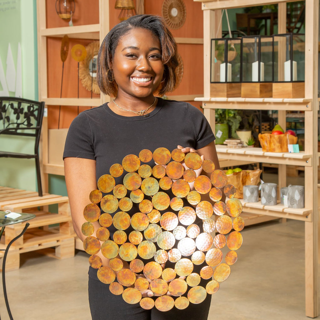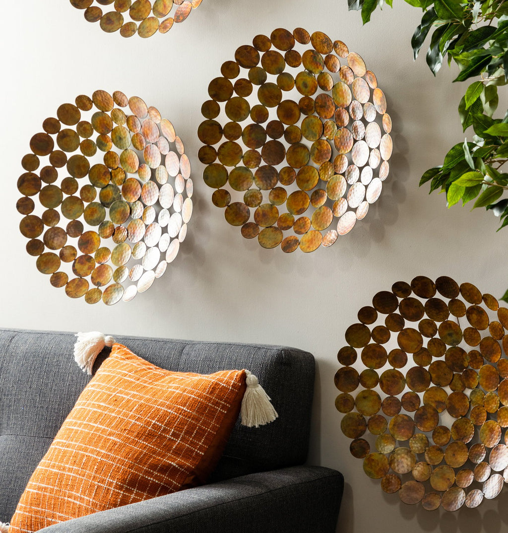 Enhance your living space with this abstract metal wall decor, featuring a captivating design of multi-colored copper-finished circles. Perfect for adding a contemporary touch to any room.