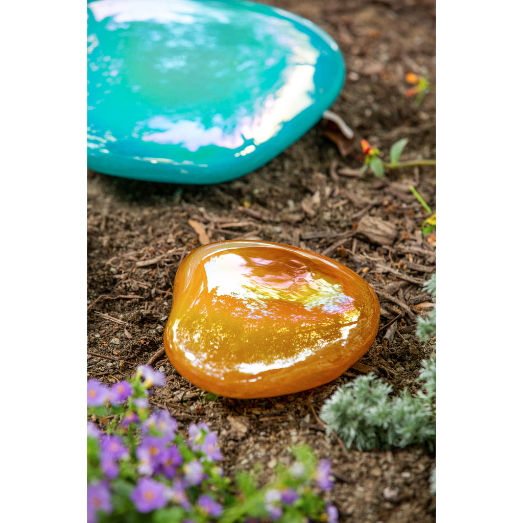 A part of our spring and summer collection, you'll enjoy a beautiful garden stone with an amber color. It is created using artisan mouth-blown techniques for a one-of-a-kind piece. High-end material and color process for an iridescent finish for a kaleido