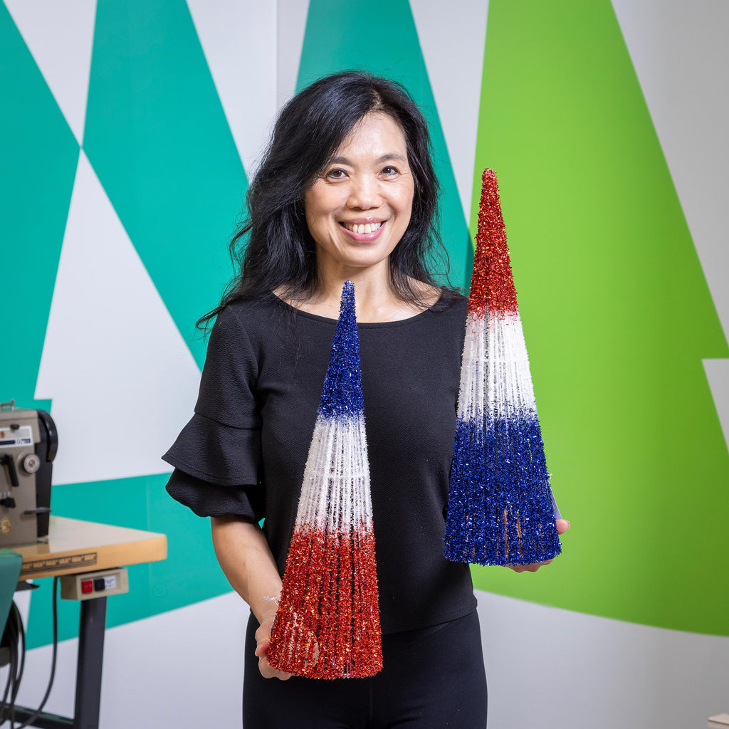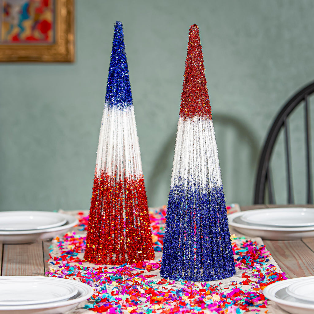 Celebrate your patriotic spirit with this glittering conical table decor, perfect for enhancing any summer gathering. Its vibrant red, white, and blue design adds a festive touch to your home.