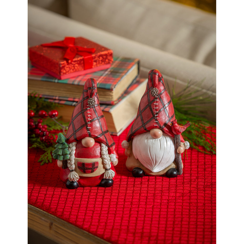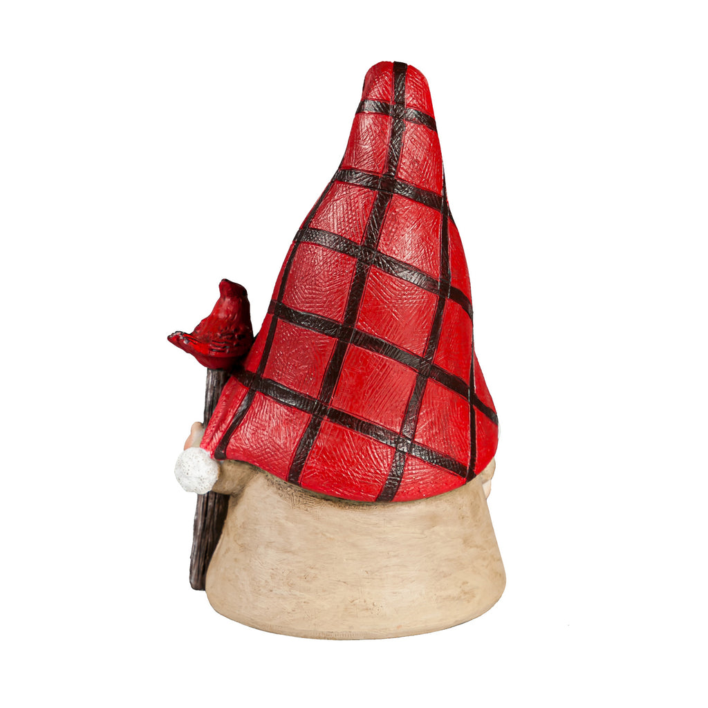 - Features a delightful gnome design with a red plaid hat and a cardinal accent.