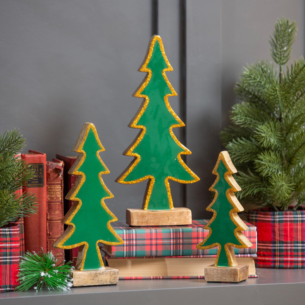 Enhance your holiday decor with this charming set of three wood and resin tree decorations, perfect for adding a festive touch to any table setting.