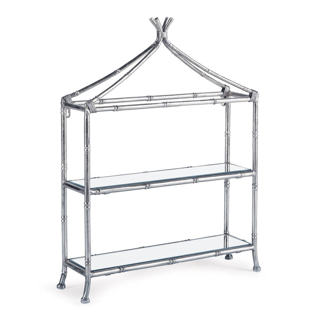 This curio shelf is a contemporary take on chinoiserie style. Smooth and refined, it is scaled to work well in smaller spaces. The finish and mirrored accents add a sense of light and reflection.