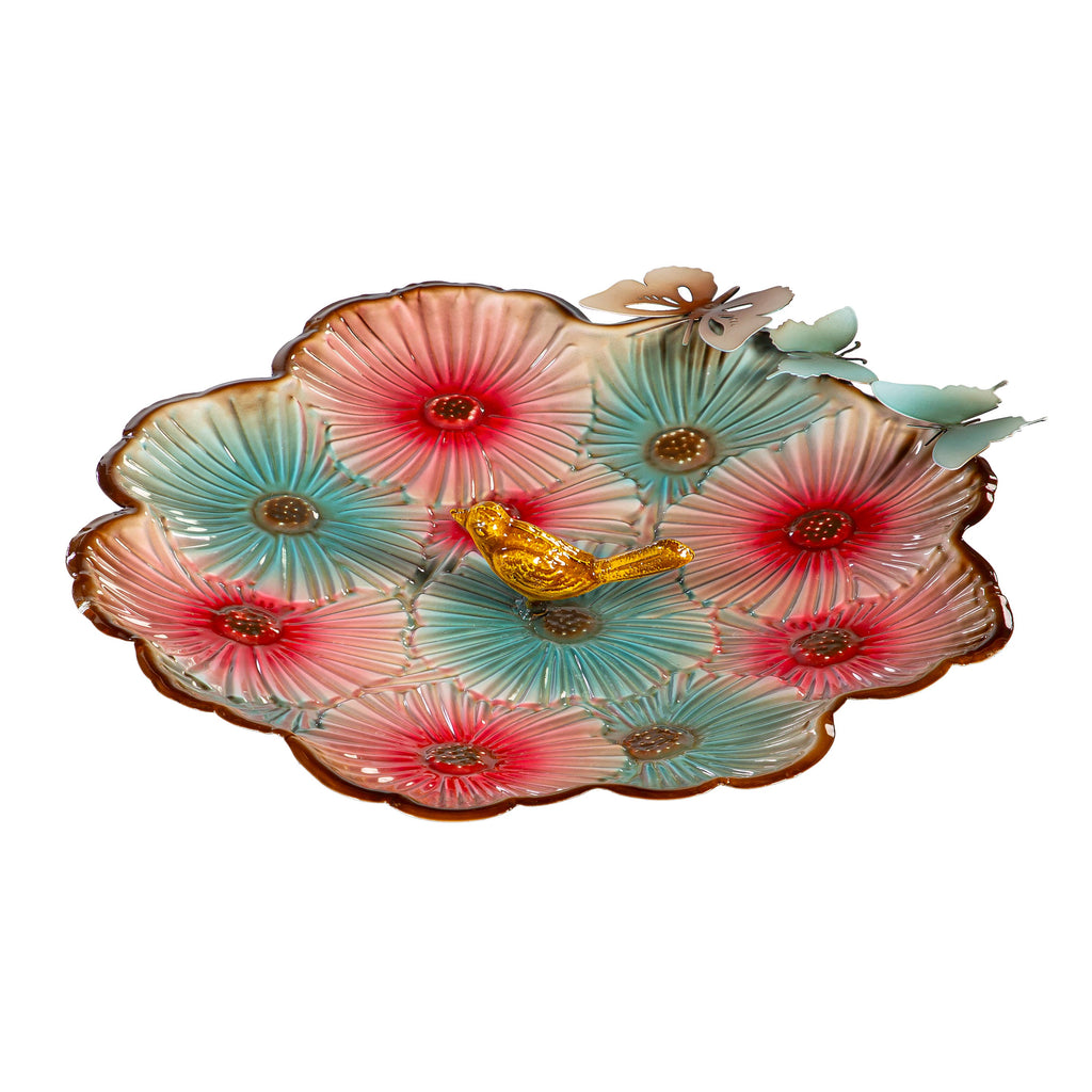 Enhance your garden with the What She Shed Birdbath, featuring a vibrant butterfly and flower design. This metal bird bath offers a charming and functional addition to any outdoor space.