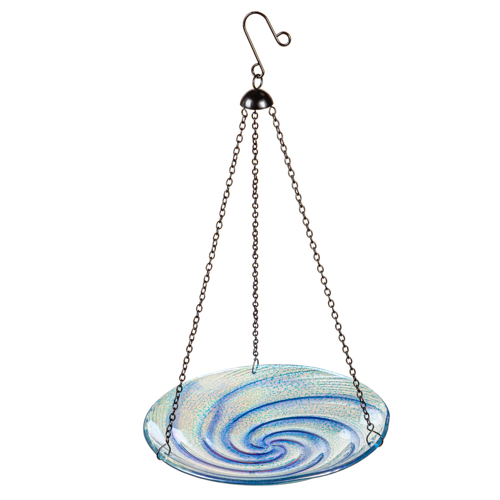 Enhance your garden with the Swirl Glass Hanging Birdbath in a captivating blue. Its elegant design and durable glass material create a serene spot for birds to refresh and beautify your outdoor space.