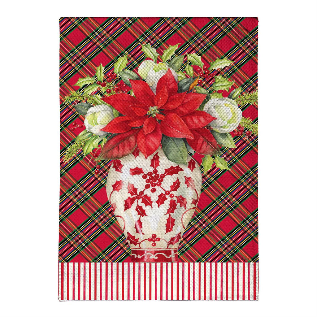 Elevate your holiday décor with the Chinoiserie Christmas Burlap House Flag. This festive flag features a vibrant red poinsettia arrangement set against a classic plaid background, perfectly capturing the spirit of the season. Made from durable burlap, it withstands the winter weather while adding a touch of elegance to your home. Measuring 28 x 44 inches, it's an ideal size for making a statement at your front entrance or garden. The intricate design and rich colors will warmly welcome guests throughout the holiday season.