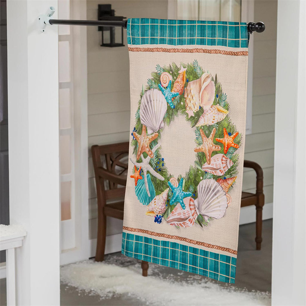 Celebrate the holiday season with a coastal twist using this Merry Christmas Shell Wreath Suede House Flag. This striking flag features a vibrant design of seashells and starfish arranged in a festive wreath, offering a unique blend of seaside charm and holiday cheer. Made from durable suede, it ensures long-lasting use and vibrant colors that resist fading. Measuring 29.0 x 43.0 inches, it's perfect for making a statement on your porch or in your garden. The flag's elegant plaid border adds a touch of sophistication, making it an ideal addition to your holiday decorations.