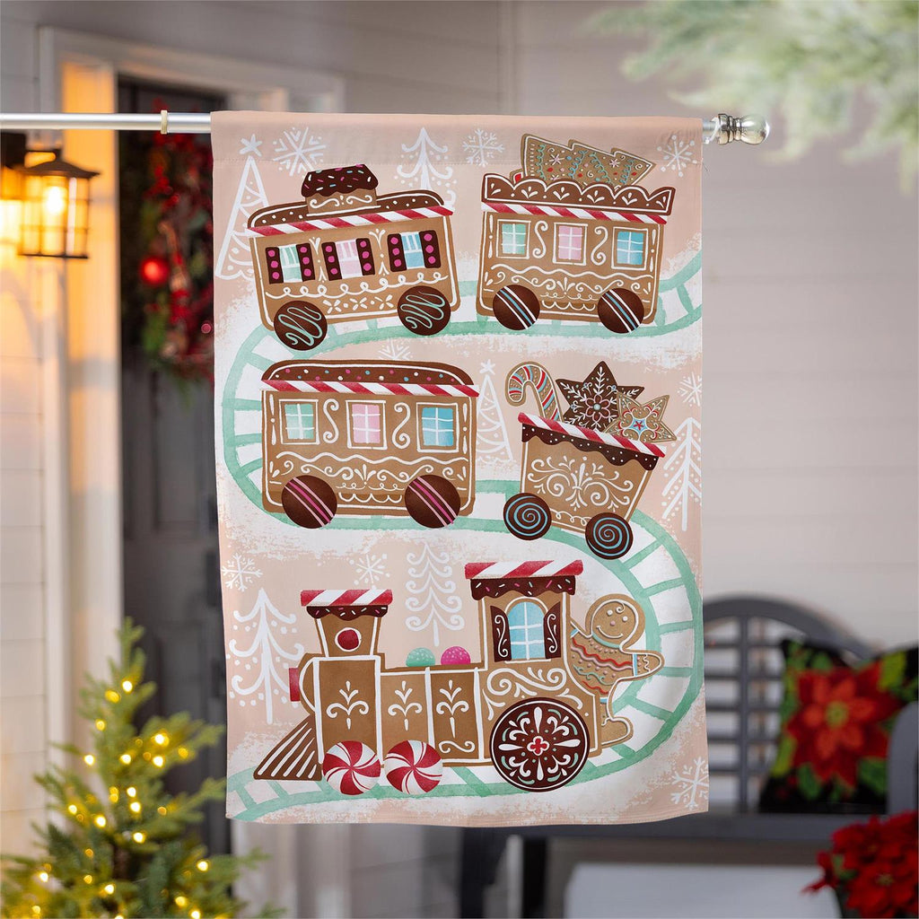 Add a touch of holiday magic to your home with the Gingerbread Train Suede House Flag. Measuring 28 inches in width and 44 inches in height, this charming flag features an adorable gingerbread train design that captures the festive spirit of the season. Crafted from durable suede, it offers a rich texture and vibrant colors that withstand the elements, making it perfect for outdoor use. The whimsical pattern includes delightful details like candy canes and festive cookies, creating a warm and inviting atmosphere for guests and passersby. Ideal for decorating your garden or entryway during the holiday season.