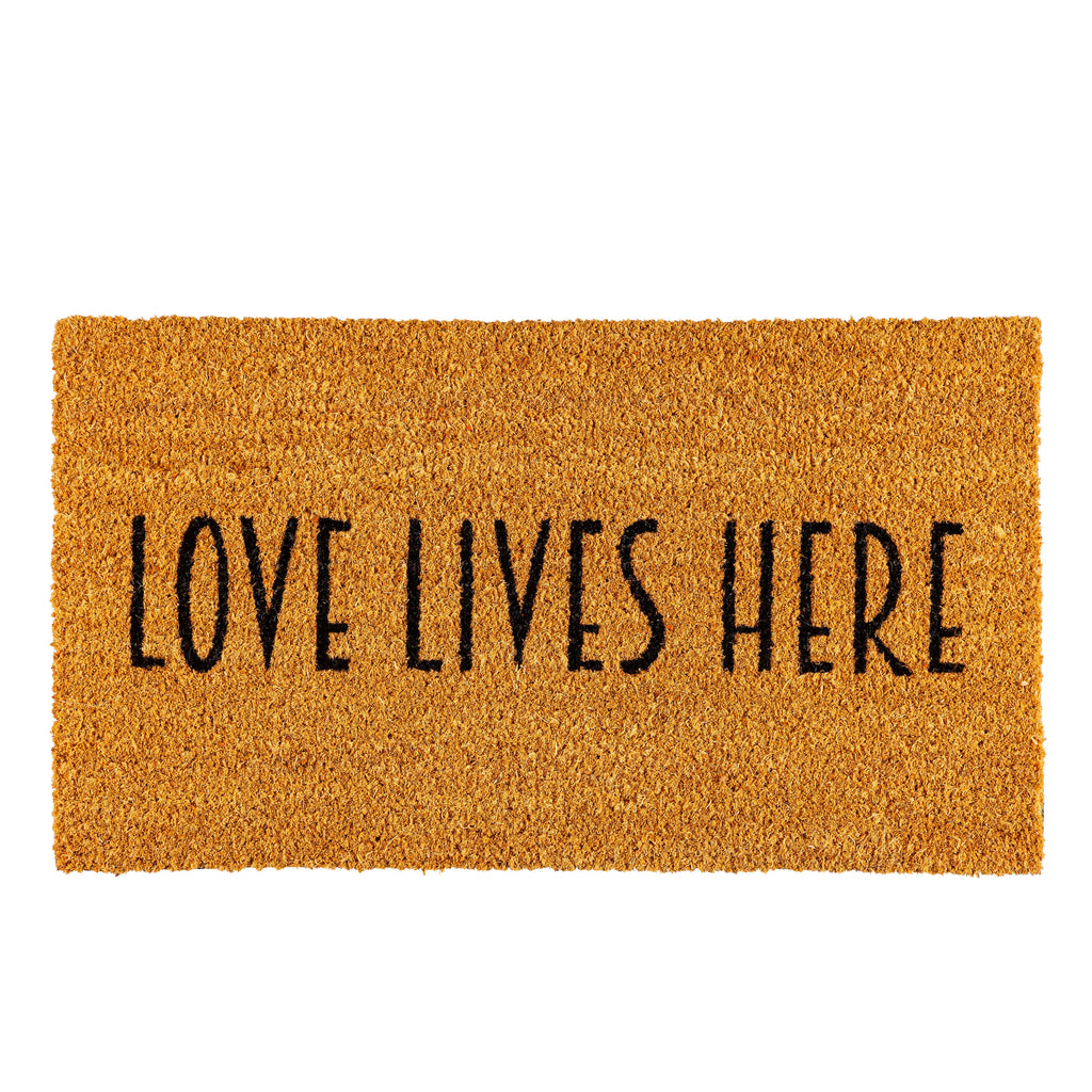 Welcome guests with warmth and style using the 'Love Lives Here' coir mat. Made from durable, natural coir fibers, this mat is designed to withstand heavy foot traffic while effectively trapping dirt and moisture. Its inviting message adds a personal touch to any doorstep, making it perfect for creating a welcoming atmosphere. Measuring 28 inches in length and 16 inches in height, this mat provides ample coverage for most entryways. Easy to clean, it's an ideal choice for busy households.