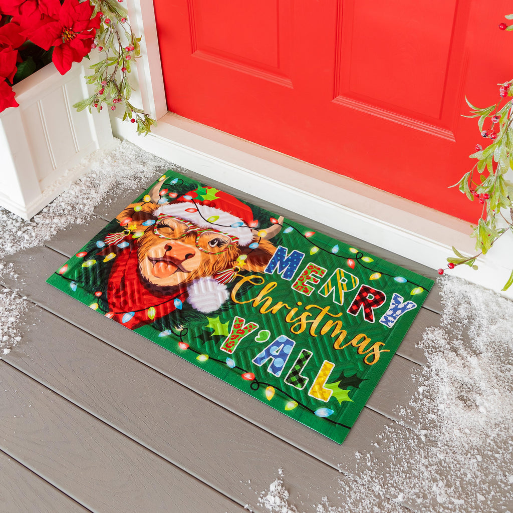 Welcome the holiday spirit with the Merry Highland Ho Embossed Mat, perfect for adding a festive touch to your entryway. This vibrant mat measures 30 inches by 18 inches, offering a cheerful greeting to guests with its whimsical Christmas design. Crafted for durability, its embossed surface ensures a non-slip experience while capturing the playful essence of the season. The mat's colorful portrayal of a holiday-themed highland cow, adorned with Santa's hat and twinkling lights, is sure to bring smiles. Ideal for both indoor and outdoor use, it’s a delightful way to celebrate the holidays.
