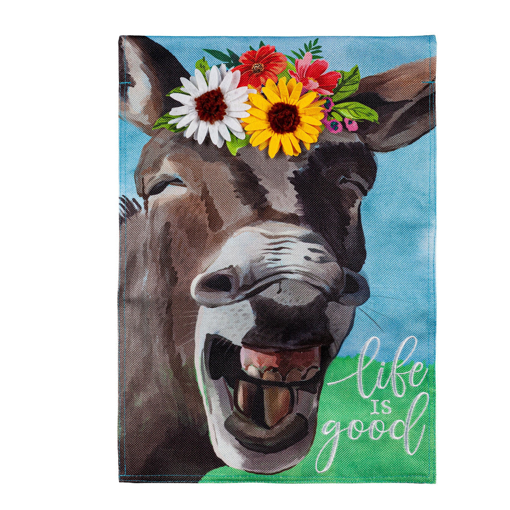 Brighten up your garden with the Donkey Friend Garden Burlap Flag, featuring a cheerful donkey adorned with a colorful flower crown and the phrase 'Life is Good'.