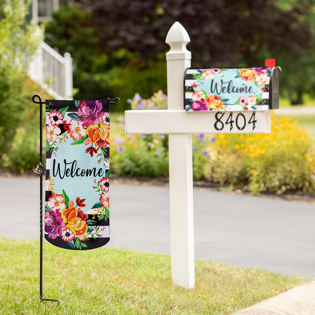 Enhance your outdoor space with the Stripes and Flowers Everlasting Impression Textile Decor, featuring vibrant floral designs on a welcoming flag.