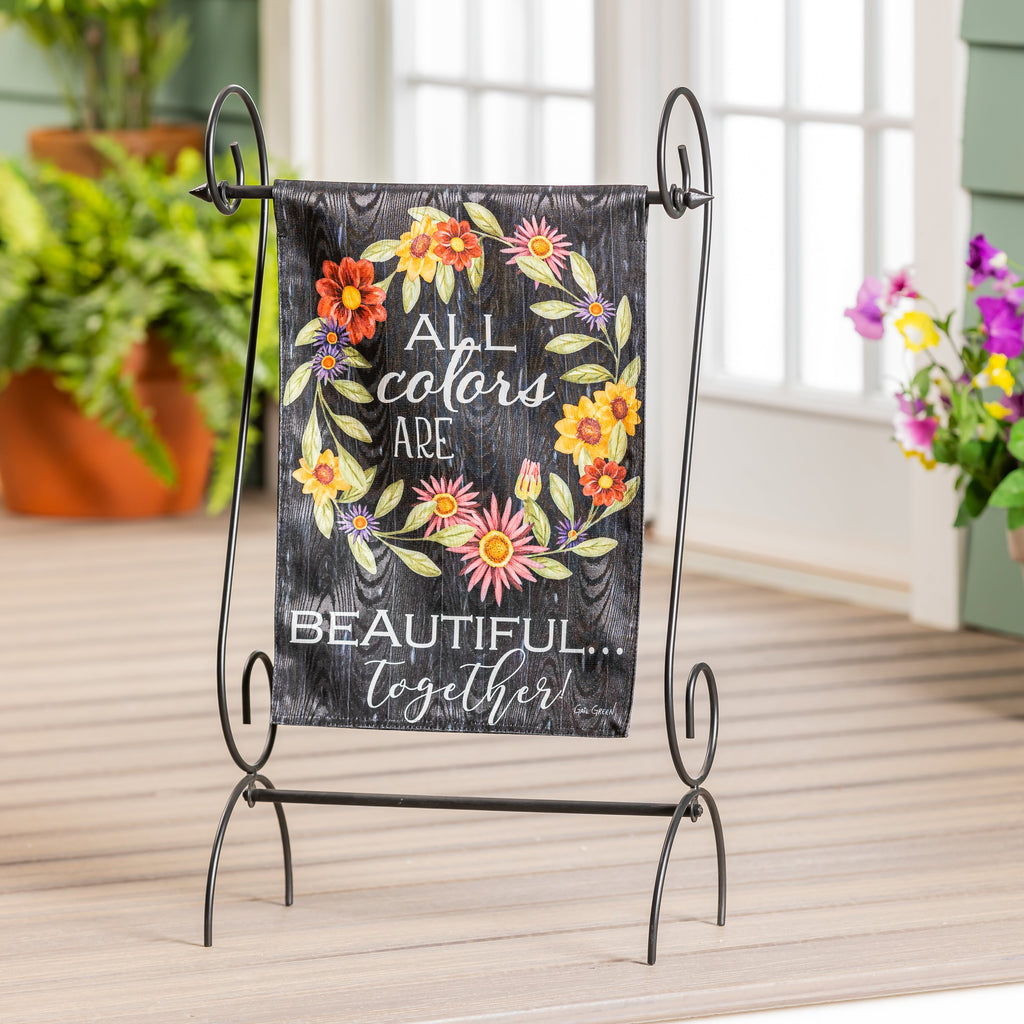 This charming garden flag showcases the message 'All Colors Are Beautiful Together,' surrounded by a vibrant floral design. Perfect for adding a welcoming touch to any outdoor space.