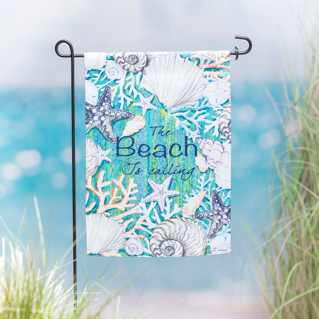 Add a rustic and tropical touch to your outdoor space with this The Beach is Calling Garden Suede Flag. Against a weathered beach wood background, passersby will stop to enjoy this design that reads "The Beach Is Calling" surrounded by sea shells and cora