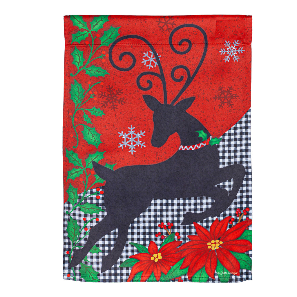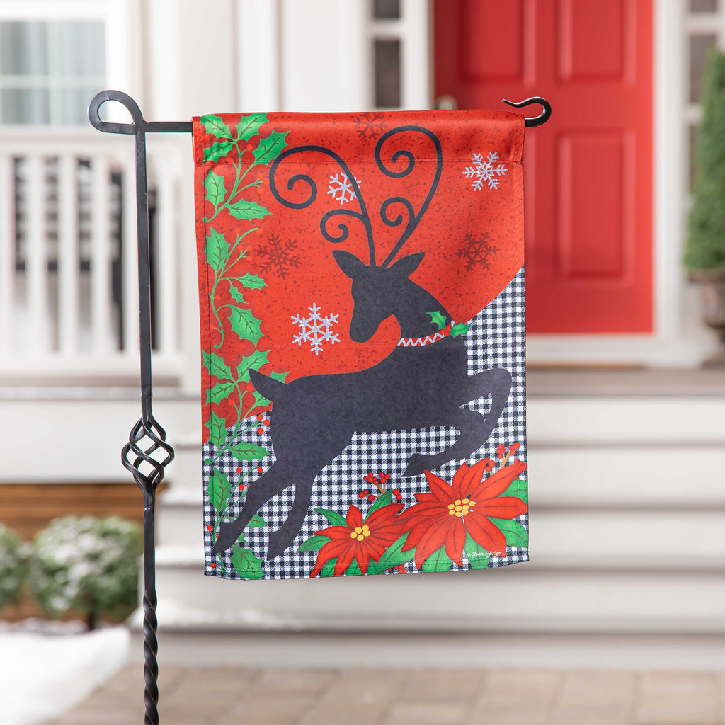 Celebrate the holiday season with this vibrant Reindeer Silhouette Suede Garden Flag, perfect for adding a festive touch to your outdoor space.