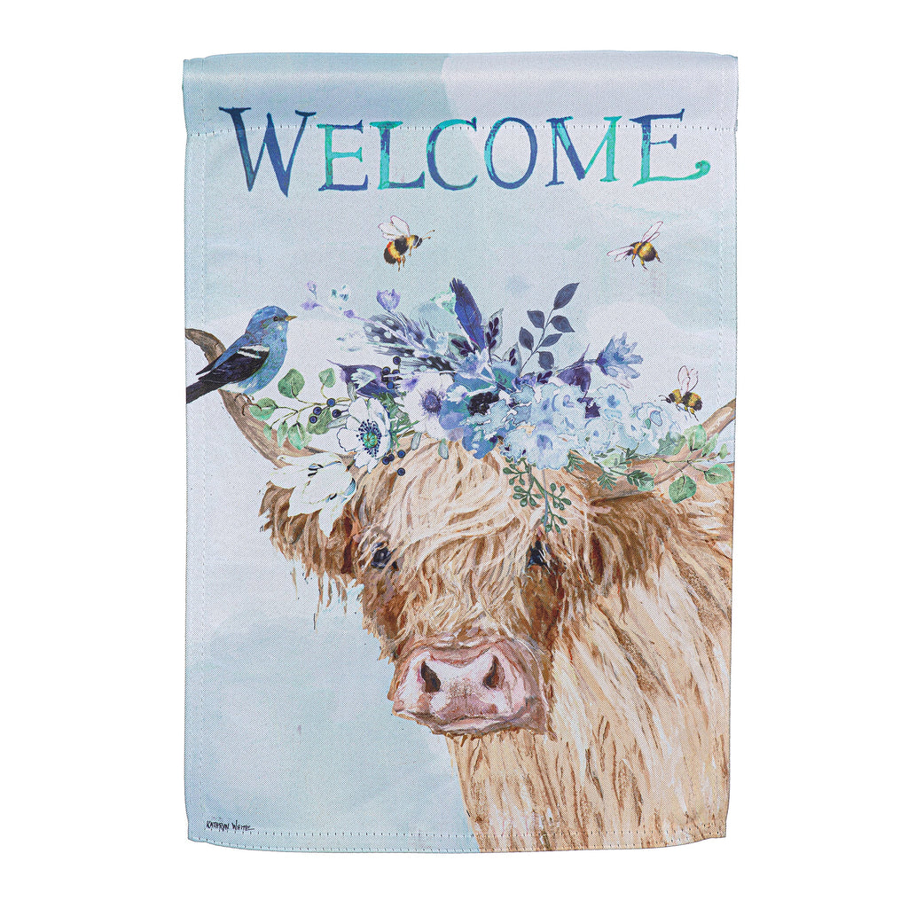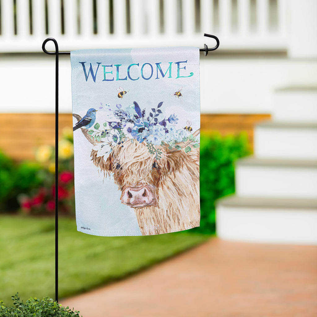 Welcome your guests with this charming Floral Cow Suede Garden Flag, featuring a delightful cow adorned with a floral crown and accompanied by buzzing bees.
