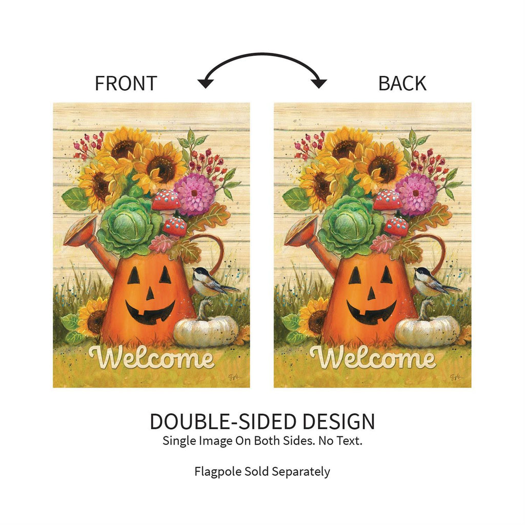 Welcome the spooky season with this charming Halloween Watering Can Suede Garden Flag. Measuring 12.5 x 18 inches, this vibrant flag features a delightful scene of a pumpkin-shaped watering can overflowing with autumn flowers and greenery. Perfect for adding a festive touch to your garden or porch, it’s made from durable suede material, ensuring it withstands the elements while maintaining its vivid colors. Ideal for Halloween enthusiasts looking to add a warm and welcoming vibe to their outdoor space. Transform your garden into a Halloween haven with this eye-catching accessory.