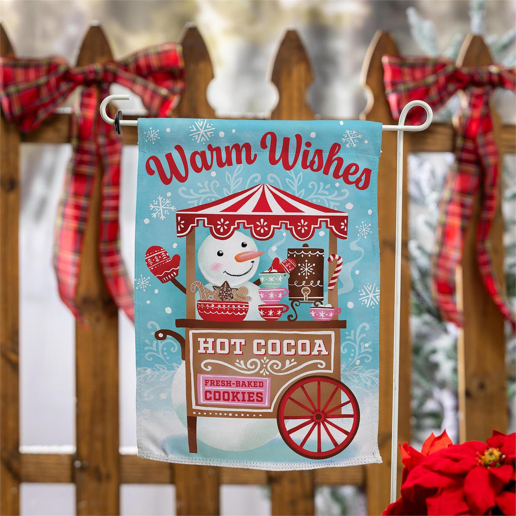 Add a touch of festive charm to your outdoor space with the Baking Spirits Bright Suede Garden Flag. Measuring 12.5 inches in length and 18 inches in height, this delightful flag features a cheerful snowman serving hot cocoa and fresh-baked cookies. Crafted from durable suede, it offers vivid colors and a soft texture, perfect for brightening any winter garden. The whimsical design and warm holiday message make it an ideal decoration for the holiday season, welcoming guests with a cozy, inviting feel.