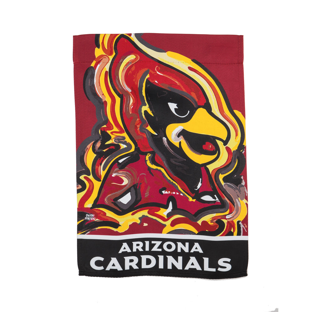 This Arizona Cardinals suede garden size flag showcases an original work of art by painter Justin Patten, featuring a whimsical take on the mascot trend for a more artisan look that everyone will love to show support for their team.