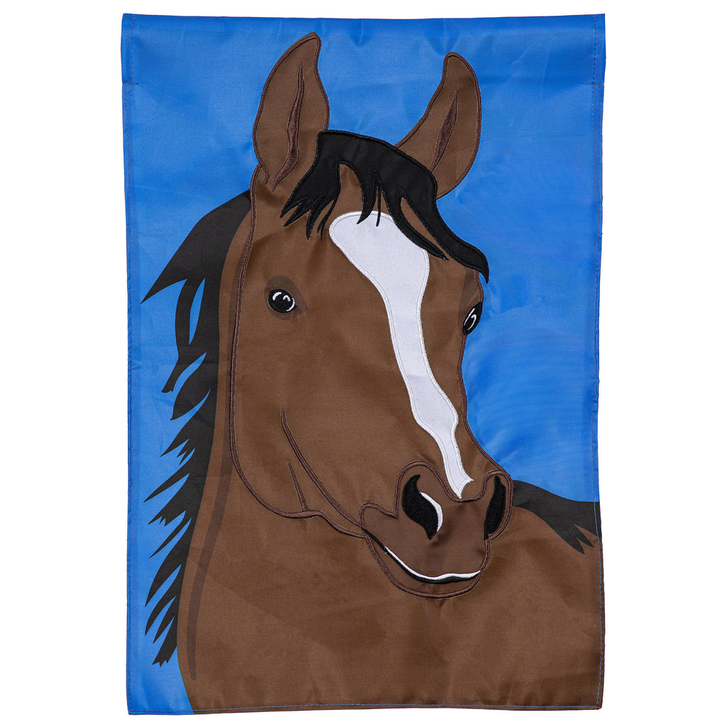 Enhance your outdoor space with this Single Horse Basic Applique Garden Flag, featuring a charming horse design against a vibrant blue background. Perfect for adding a touch of equestrian elegance to your garden in the springtime.