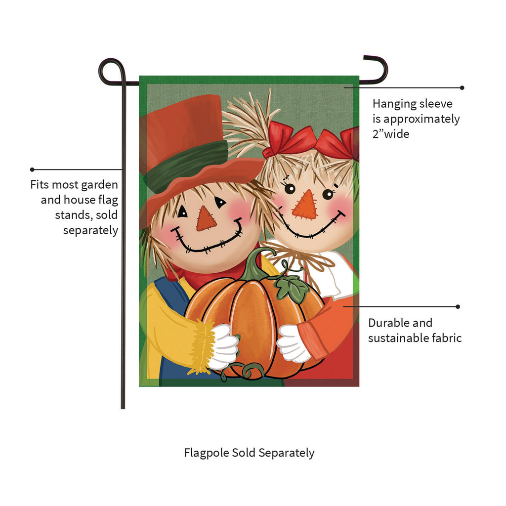 Celebrate the fall season with this charming Couple Of Scarecrows Applique Garden Flag, featuring a delightful scarecrow pair surrounded by pumpkins.