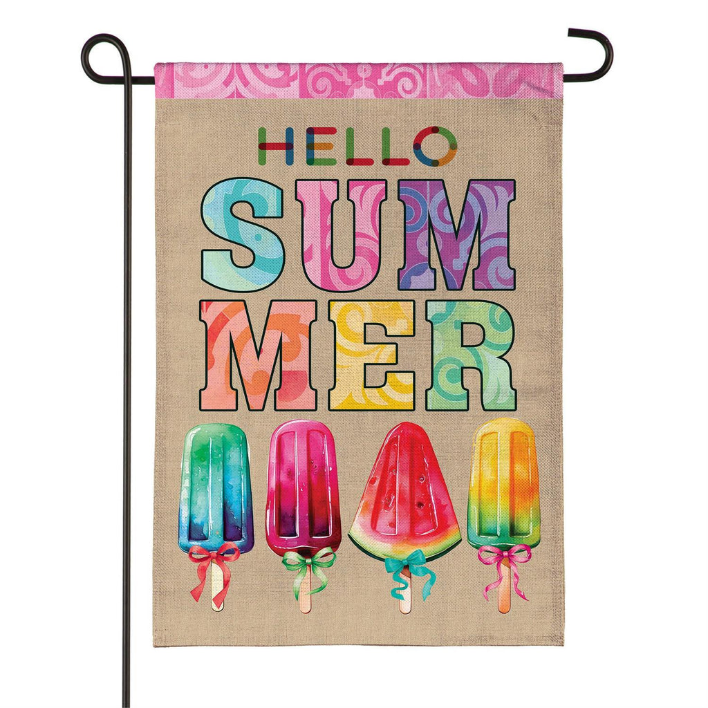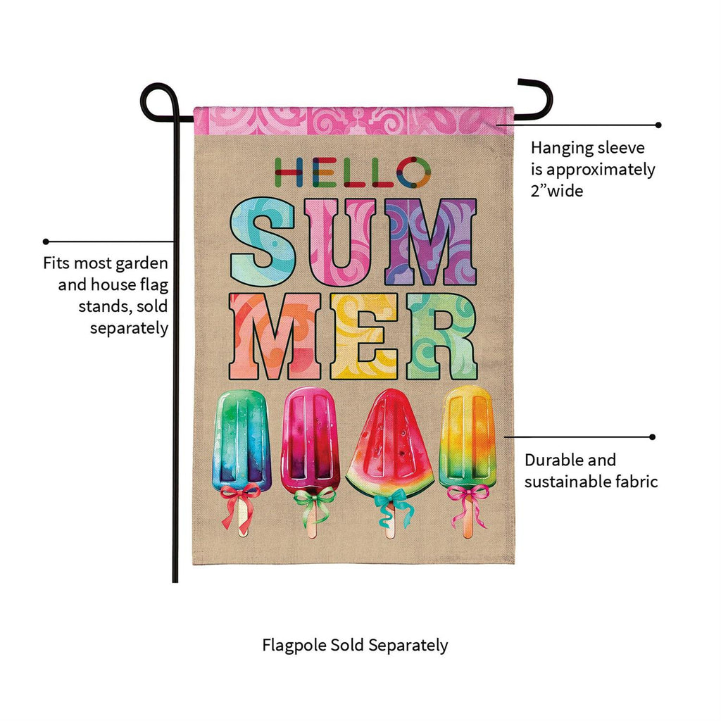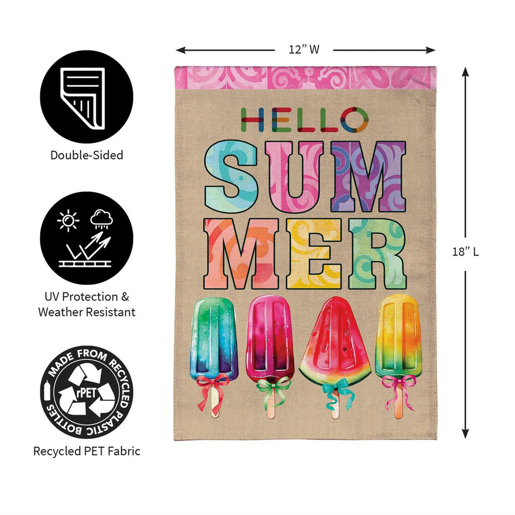 Welcome the warm season with the vibrant Summer Popsicle Burlap Garden Flag. Perfect for adding a splash of color to your outdoor space, this flag features a delightful array of popsicles and cheerful lettering that reads 'Hello Summer.' Made from high-quality burlap, it promises durability and a charming rustic look. Measuring 18 x 12.5 inches, its compact size makes it ideal for any garden, patio, or backyard. The flag is easy to install and will make a charming addition to your seasonal décor.