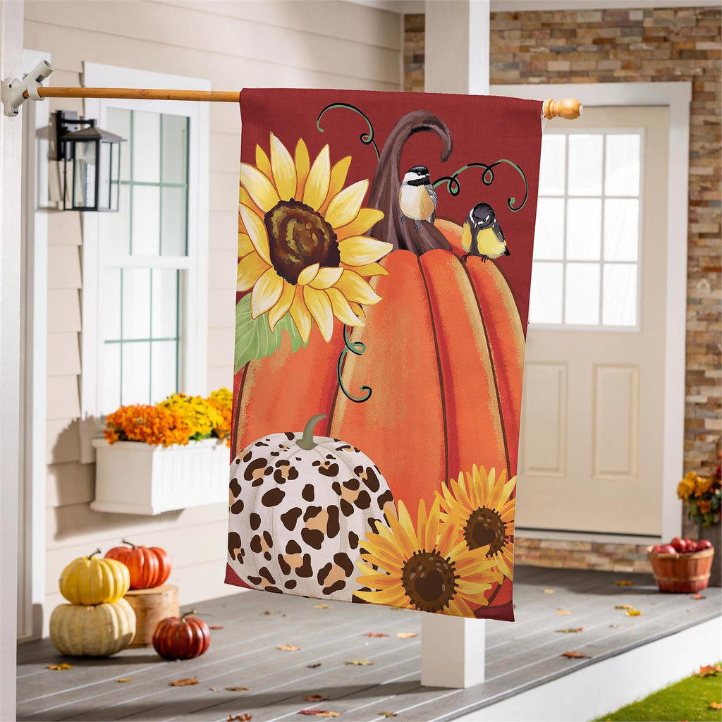 Add a touch of whimsy to your outdoor décor with this Animal Print Pumpkin Suede House Flag. Perfect for fall, this flag features vibrant sunflowers and charming birds perched on a large orange pumpkin. The unique animal print on the smaller pumpkin adds a fun and stylish twist to traditional autumn themes. Crafted from high-quality suede, it offers durability and a soft texture that withstands the elements. Measuring 29 x 0.25 x 43 inches, this flag is an eye-catching addition to any garden or entryway.