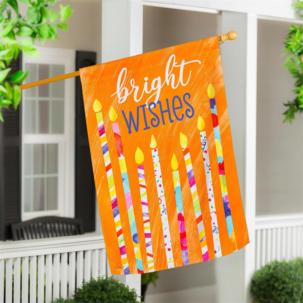This charming flag adds an extra special touch to any home. It features a birthday party themed design with vibrant colors. Flag is crafted of medium-weight suede fabric made from recycled plastic that provides a soft and durable texture. Artwork is heat transferred onto the sun-blocking material so that it is easily viewed from both sides. The weatherproof flag will not fray or fade with continued outdoor use. This flag features a sleeve for use with any standard flagpole or stand, sold separately.