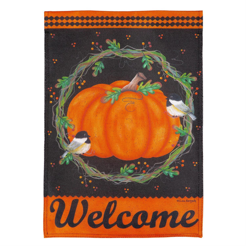 Add a touch of autumn charm to your outdoor space with the Chickadee and Pumpkin Burlap House Flag. Measuring 28.0 inches in width and 44.0 inches in height, this vibrant flag features a delightful design of chickadees perched around a large pumpkin, surrounded by greenery. The warm orange and black color palette is perfect for fall, creating an inviting atmosphere at your home’s entrance. Made from durable burlap, this flag is designed to withstand outdoor elements while maintaining its rich colors.