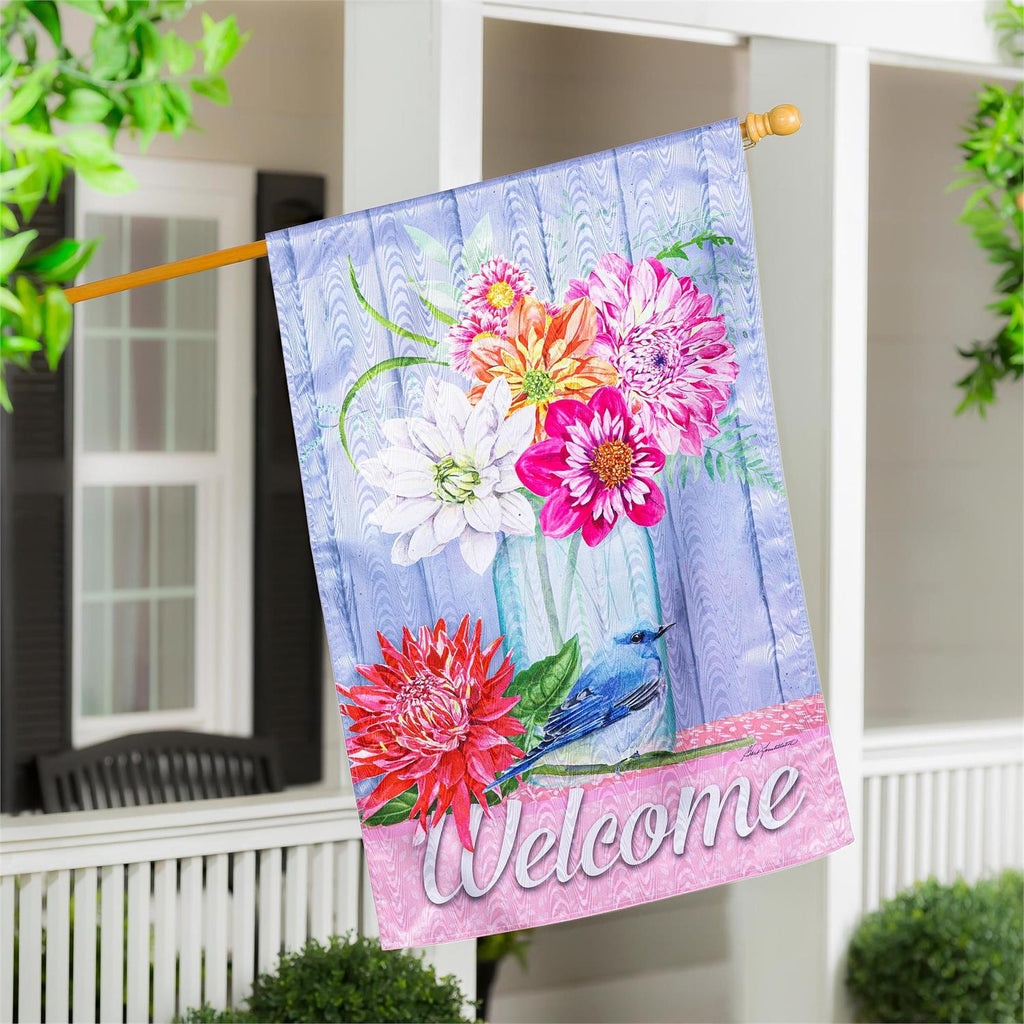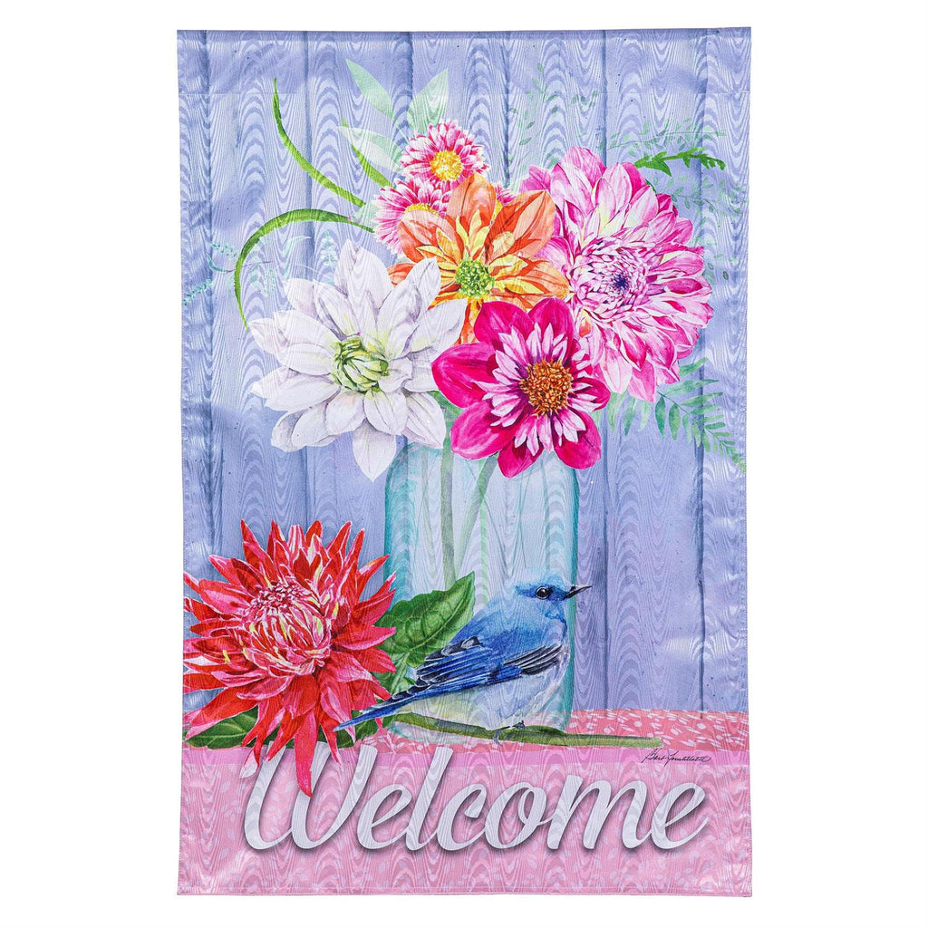 Create a warm welcome at home with this charming moire flag. It features a beautiful floral design that's perfect for the season and beyond. These double-sided Moire flags deliver unmatched shimmer with a beautiful woodgrain effect that's readable on both sides and illuminates in sunlight. Enjoy all-weather features with heat transferred artwork, UV protected dyes, and sun-blocking material that offer brilliant color and non-fray durability. This flag features fabric made from recycled plastic; it will contribute to Evergreen’s efforts to save over 75 million plastic bottles from landfills each year (assumes an 18.6 oz. bottle). It's both beautiful and eco-friendly!