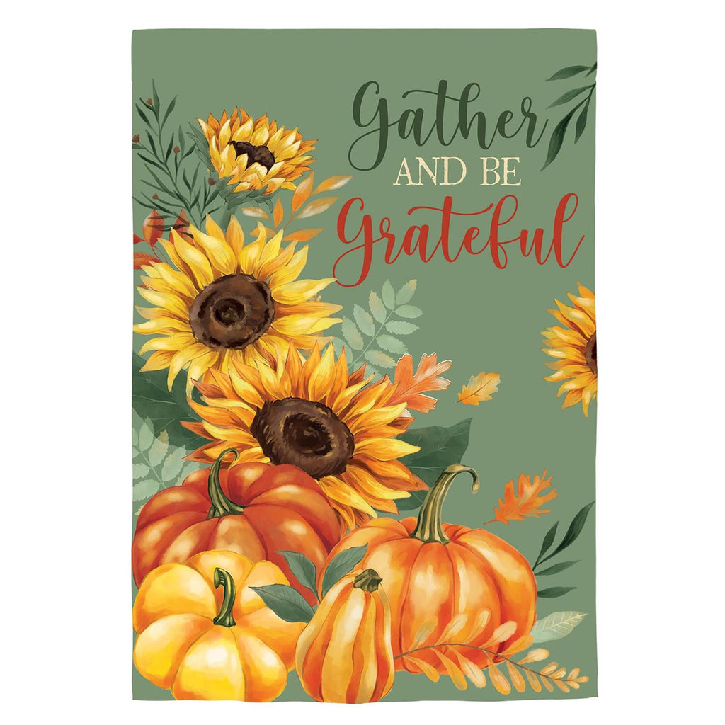 Enhance your home's seasonal charm with the Grateful Gatherings Suede House Flag. Perfect for autumn, this flag features vibrant sunflowers and pumpkins, set against an earthy green background. Measuring 29 inches in width and 43 inches in height, it's crafted from durable suede for a soft texture and lasting outdoor use. The inspiring 'Gather and Be Grateful' message adds warmth and welcome to any entryway, making it a delightful addition to your fall decor.