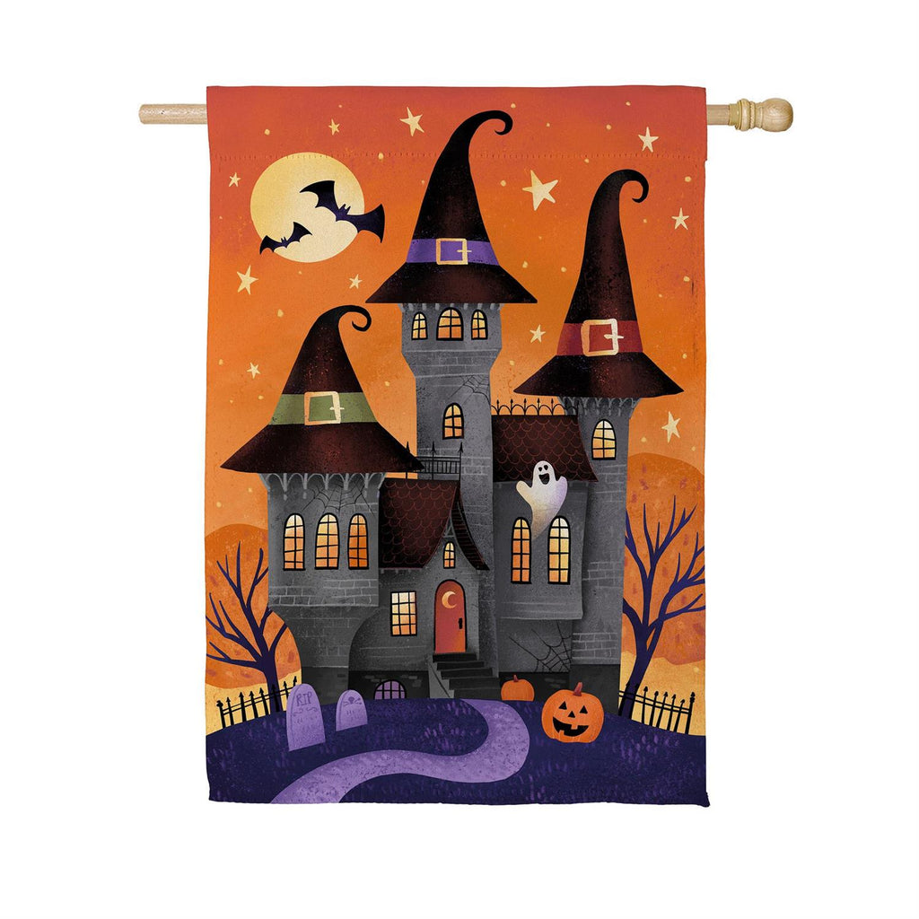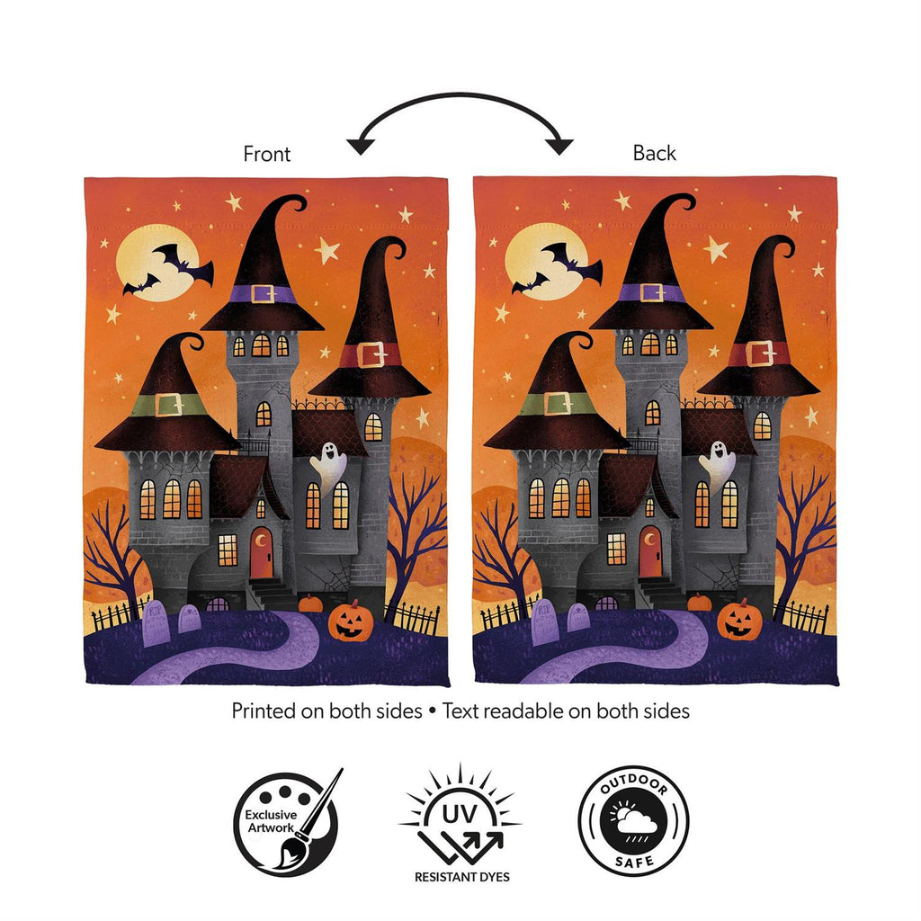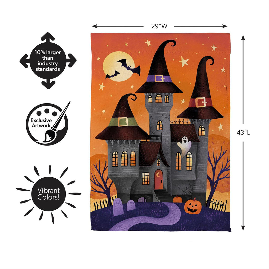 Transform your home into a spooky haven with this Haunted House Nighttime Suede Flag. Perfect for the Halloween season, this flag features a vivid scene of a haunted house under a full moon with flying bats and stars. Crafted from durable suede, the flag is designed to withstand the elements while maintaining its vibrant colors. With dimensions of 29 x 43 inches, it’s the ideal size to make a bold statement on your front porch or in your garden. Embrace the spirit of Halloween and welcome trick-or-treaters with this enchanting decoration.