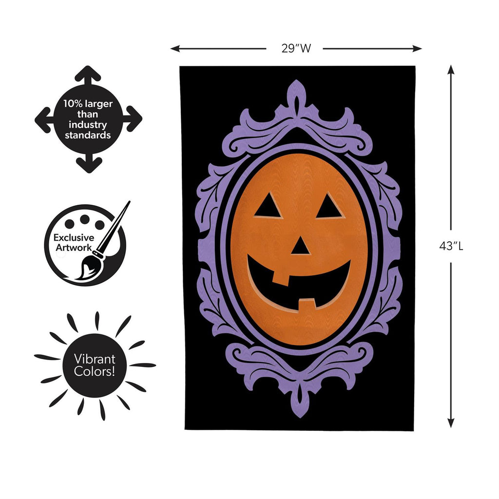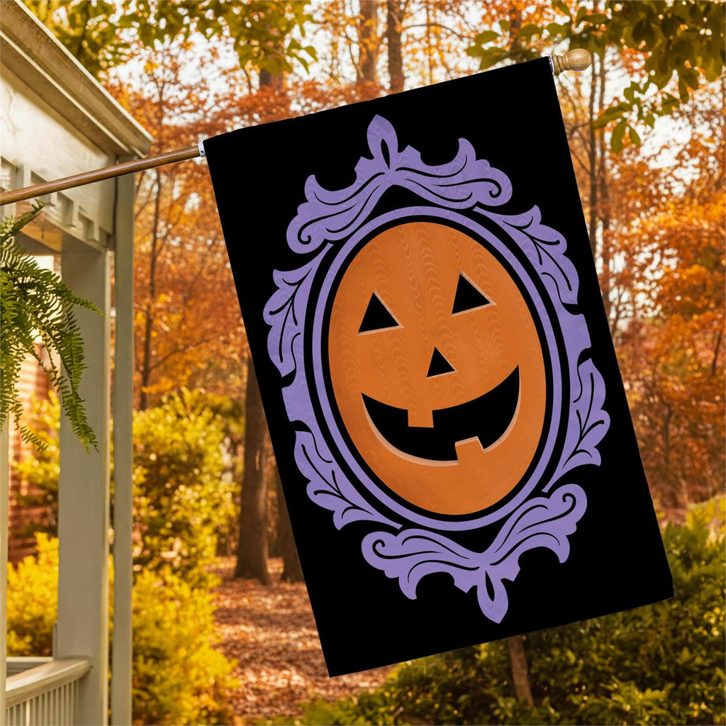 Elevate your Halloween decor with the Haunted House Pumpkin Moire Flag. Measuring 28 inches in width and 44 inches in height, this striking flag features a classic jack-o'-lantern design framed in an ornate purple border, set against a deep black background. Its moire pattern adds a unique visual texture, making it a standout piece for your porch or garden. Made for the fall season, this flag is perfect for adding a festive touch to your home while welcoming trick-or-treaters with a spooky charm.