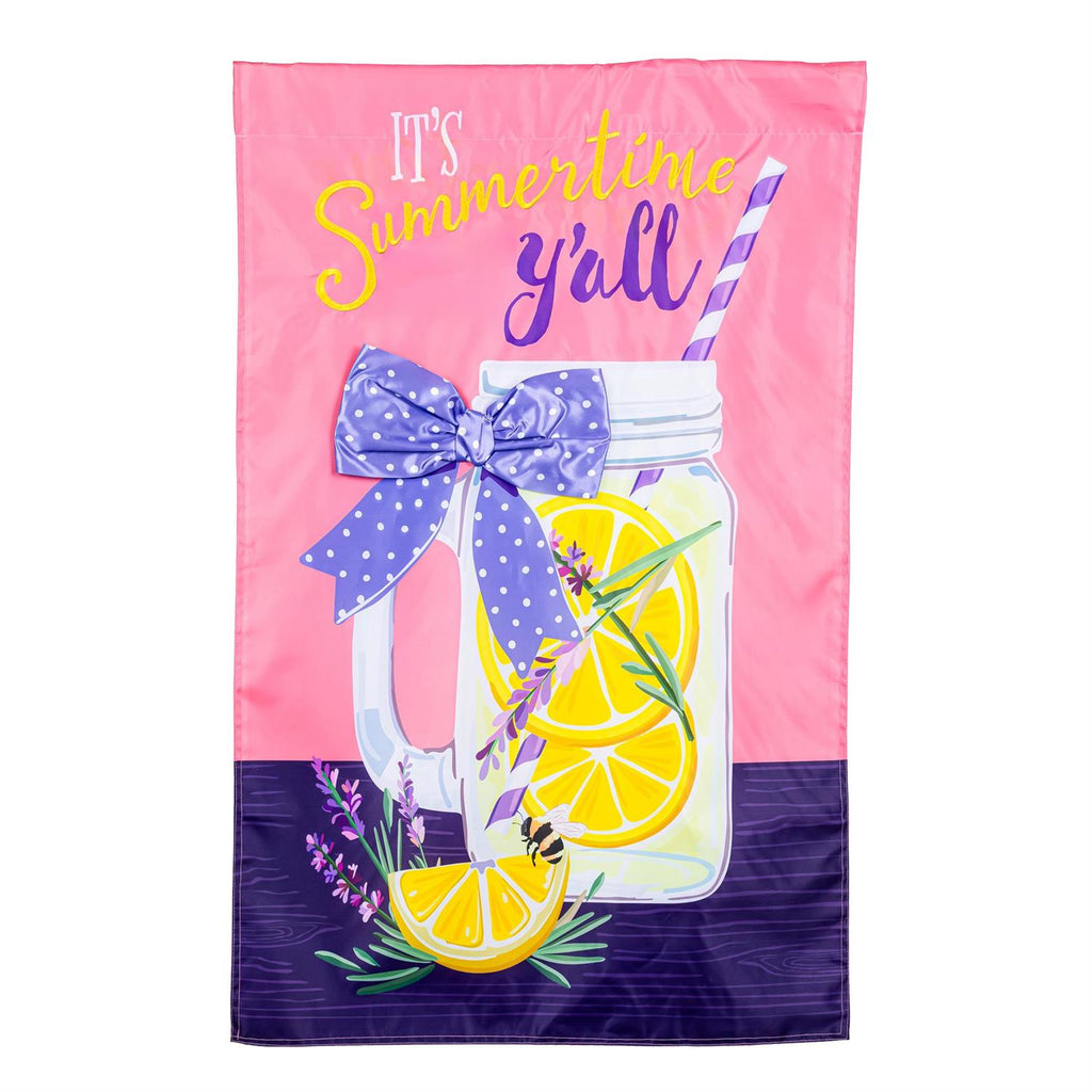 Welcome the warmth of summer to your home with the Lavender Lemonade Applique House Flag. This vibrant flag features a refreshing lemonade design, complete with bright lemons and fragrant lavender sprigs, all wrapped with a charming polka dot bow. The cheerful message 'It's Summertime Y'all' adds a touch of Southern hospitality to your garden or porch. Made of durable fabric, this applique flag is designed to withstand the elements, ensuring your summer spirit remains bright all season long. Perfect for outdoor gatherings, it brings a festive and inviting atmosphere to any home.