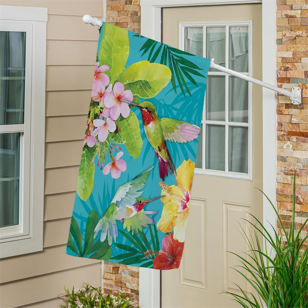 Transform your outdoor space into a tropical paradise with the Paradise Birds Suede House Flag. Measuring 43 inches in length and 29 inches in width, this vibrant flag features a stunning design of exotic birds and lush foliage. Made from durable suede, it is designed to withstand the elements while maintaining its bright and colorful appearance. Perfect for adding a splash of color to your garden or front porch, this flag is an ideal choice for nature lovers and those looking to enhance their home's curb appeal.