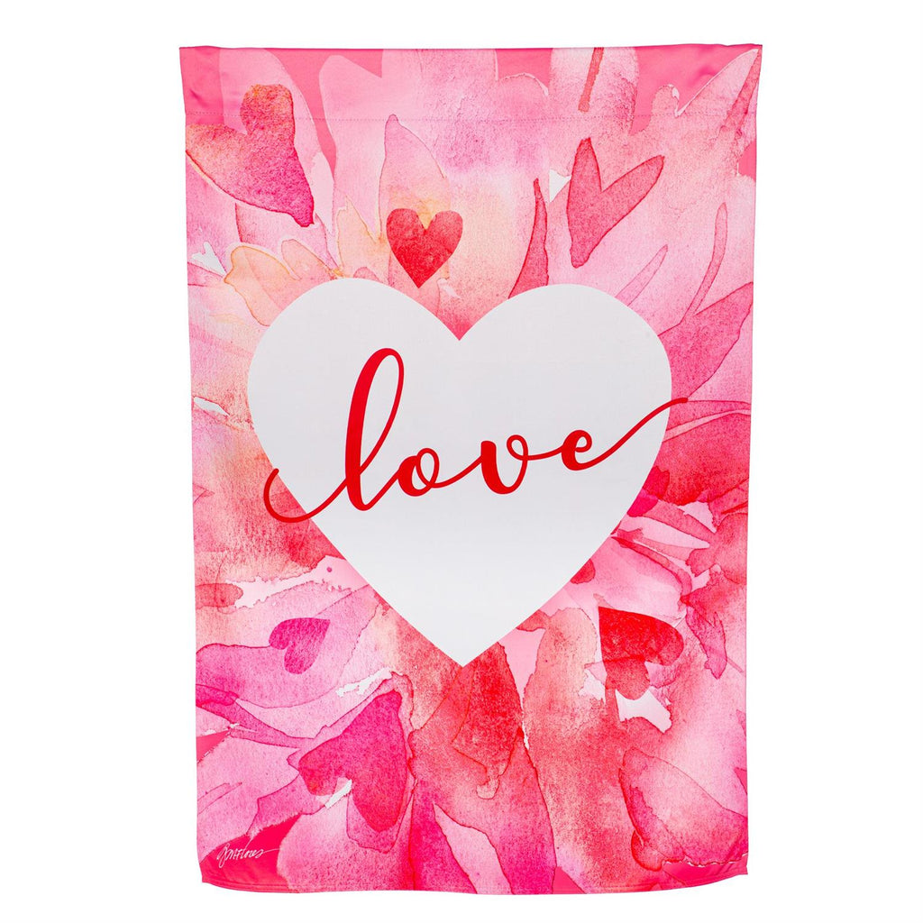 This charming flag adds an extra special touch to any home. Features lively colors and attractive Petal Heart Valentines Day design. Flag is crafted of medium-weight suede fabric made from recycled plastic that provides a soft and durable texture. Artwork is heat transferred onto the sun-blocking material so that it is easily viewed from both sides. The weatherproof flag will not fray or fade with continued outdoor use. This flag features a sleeve for use with any standard flagpole or stand, sold separately.