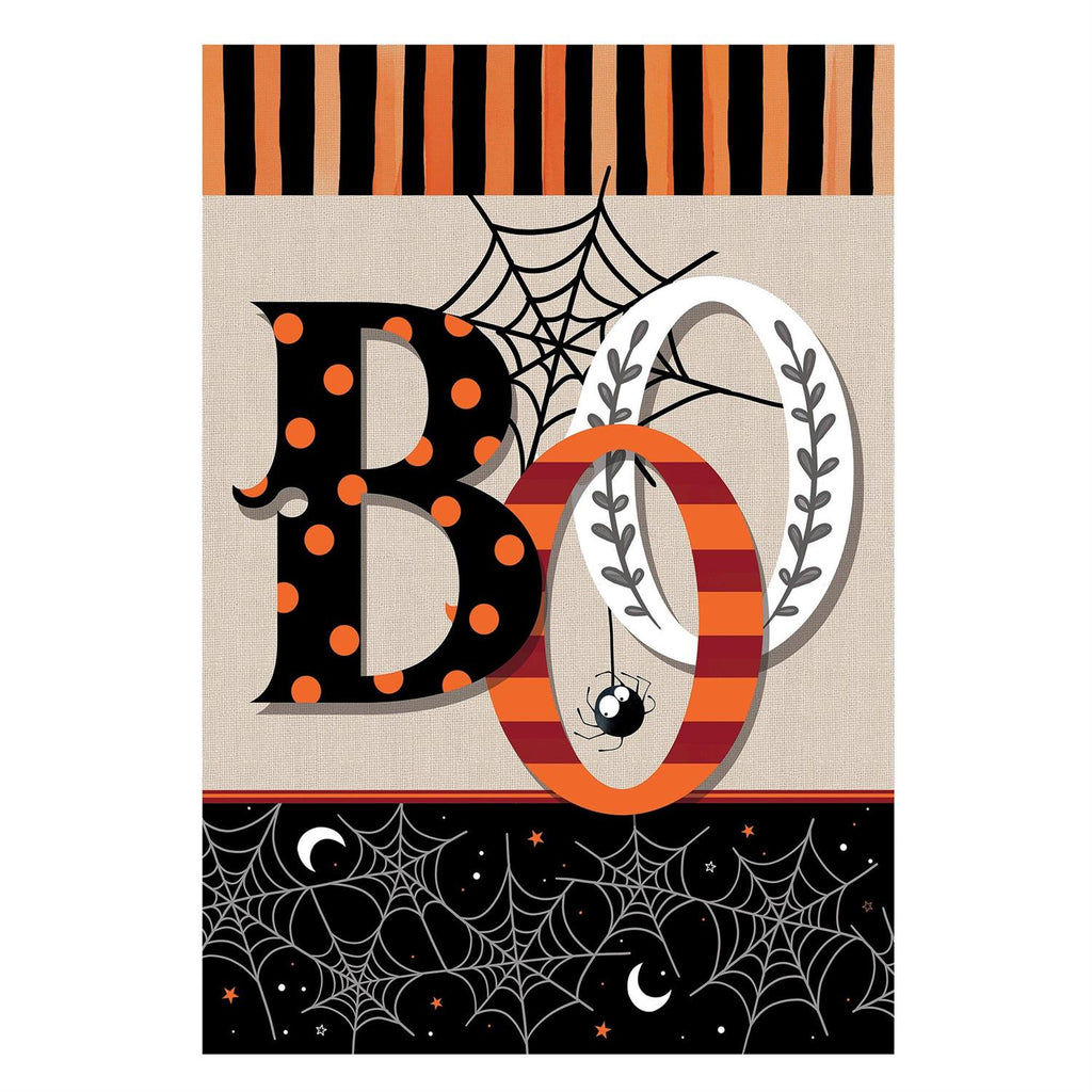 Elevate your Halloween décor with this Polka Dots & Stripes Boo Suede House Flag. Measuring 29 inches by 43 inches, this flag features a playful combination of polka dots and stripes, perfect for adding a festive touch to your home. The bold 'Boo' design, adorned with spider webs and a charming spider, captures the spirit of the season. Crafted from durable suede, it offers a lasting quality that withstands outdoor elements. Ideal for welcoming trick-or-treaters or enhancing your seasonal display.
