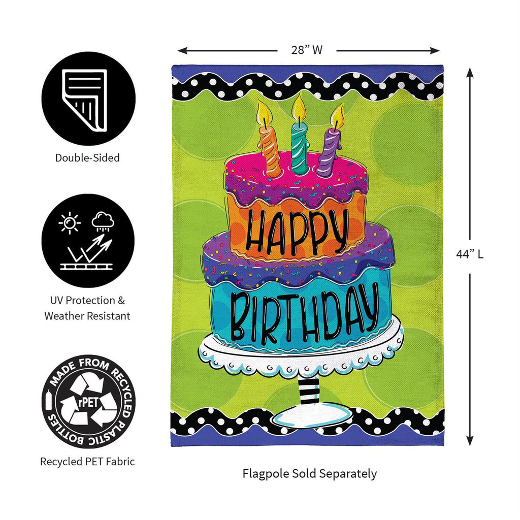 Celebrate birthdays with a splash of color using the Ric Rac Happy Birthday Cake Burlap House Flag. Measuring 44 x 28 inches, this vibrant flag features a playful birthday cake design with colorful candles and a polka dot border, making it the perfect addition to your outdoor decor. Crafted from durable burlap, it is designed to withstand various weather conditions while maintaining its vivid colors. Whether you're hosting a party or just want to spread some birthday cheer, this flag is sure to delight guests and neighbors alike.