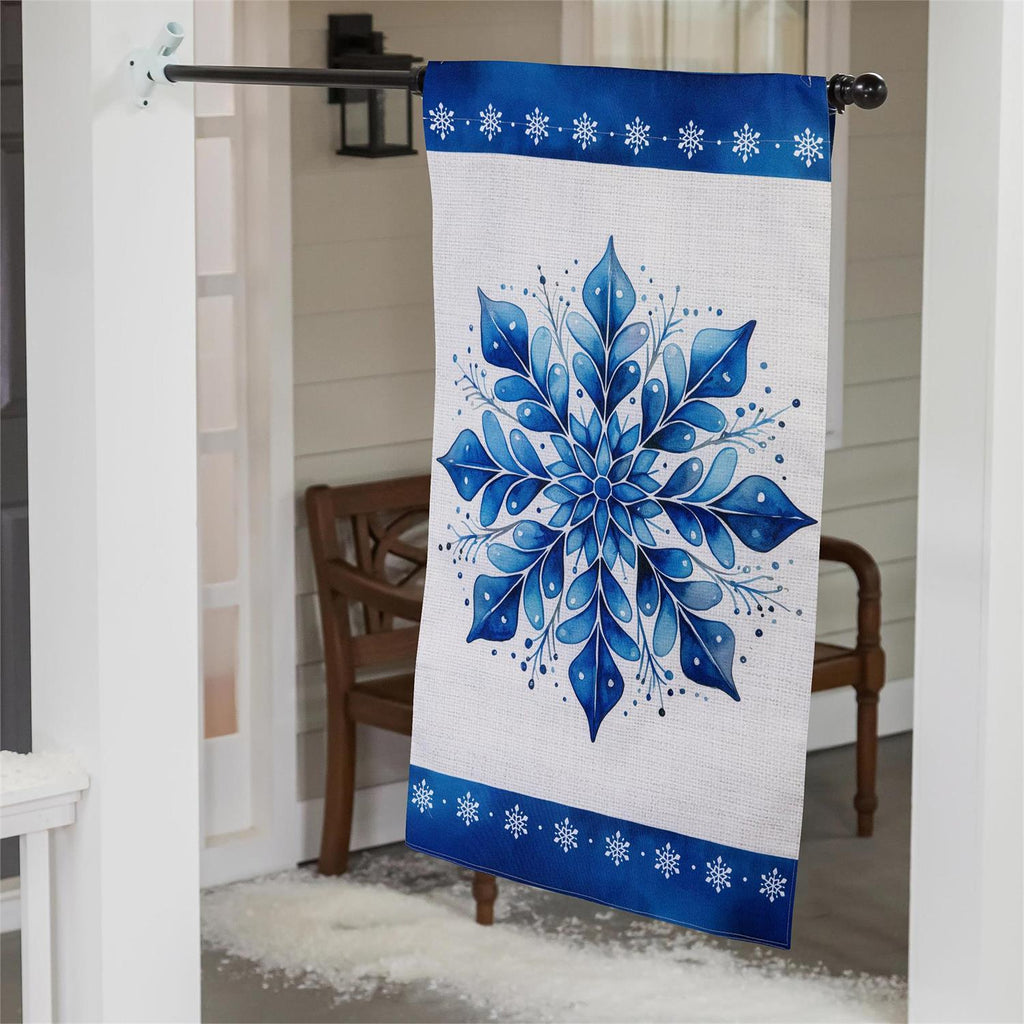 Enhance your winter décor with this Sparkling Snowflake Burlap House Flag. Measuring 28 inches in width and 44 inches in height, this flag is the perfect addition to your seasonal decorations. Crafted from durable burlap, it features a striking snowflake design with shades of blue, seamlessly blending with the snowy season. The flag's elegant border adds a finishing touch, making it a captivating display on any porch or garden. Ideal for creating a warm and inviting atmosphere during the holidays, this flag is a must-have for any winter enthusiast.