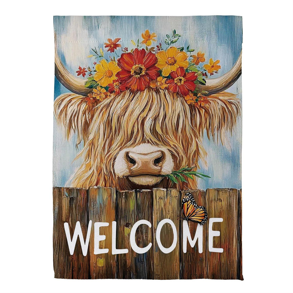 Welcome guests with the charming Summer Highland Cow Suede House Flag. This delightful flag features a whimsical highland cow adorned with a vibrant floral crown, set against a rustic wooden backdrop. Measuring 43 inches in length and 29 inches in width, it’s crafted from durable suede material to withstand the elements while maintaining its vivid colors. Perfect for adding a touch of rustic charm to your home’s exterior, this flag is ideal for summer and spring displays. The addition of a butterfly detail adds an extra element of nature-inspired beauty.