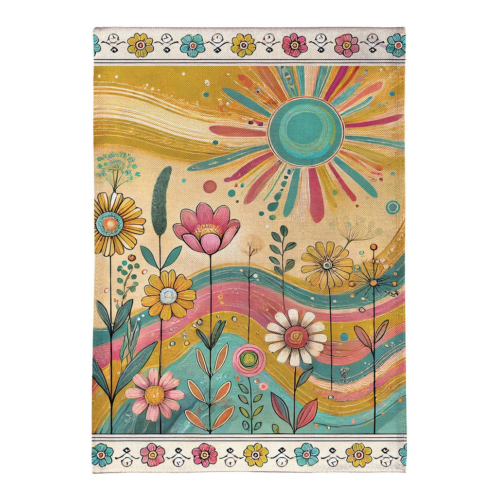 Welcome the warmth and vibrancy of the outdoors with the Sunny Field Burlap House Flag. This beautifully designed flag features a whimsical sun and floral motif, perfect for adding a cheerful touch to your garden or porch. Crafted from durable burlap, this flag is designed to withstand the elements while maintaining its vivid colors. Measuring 44 inches in length and 28 inches in width, it provides a bold statement and a welcoming vibe for any home. Ideal for seasonal decoration or year-round display, this flag will brighten up your outdoor space with its delightful design.