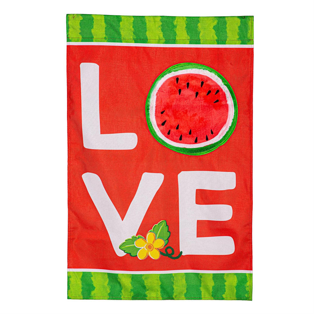 Add a refreshing touch to any yard or garden with this flag. With its watermelon design and “Love” message, this flag welcomes friends and family to the home in style. This flag is made of medium-weight, soft burlap fabric that's made from recycled plastic that has the look and feel of real burlap. Artwork is heat transferred onto both sides of the textured fabric to create a natural, crafted look. The flag is durable and weatherproof and will not fade or fray after continued display. This flag features a sleeve for use with any standard flagpole or stand, sold separately.