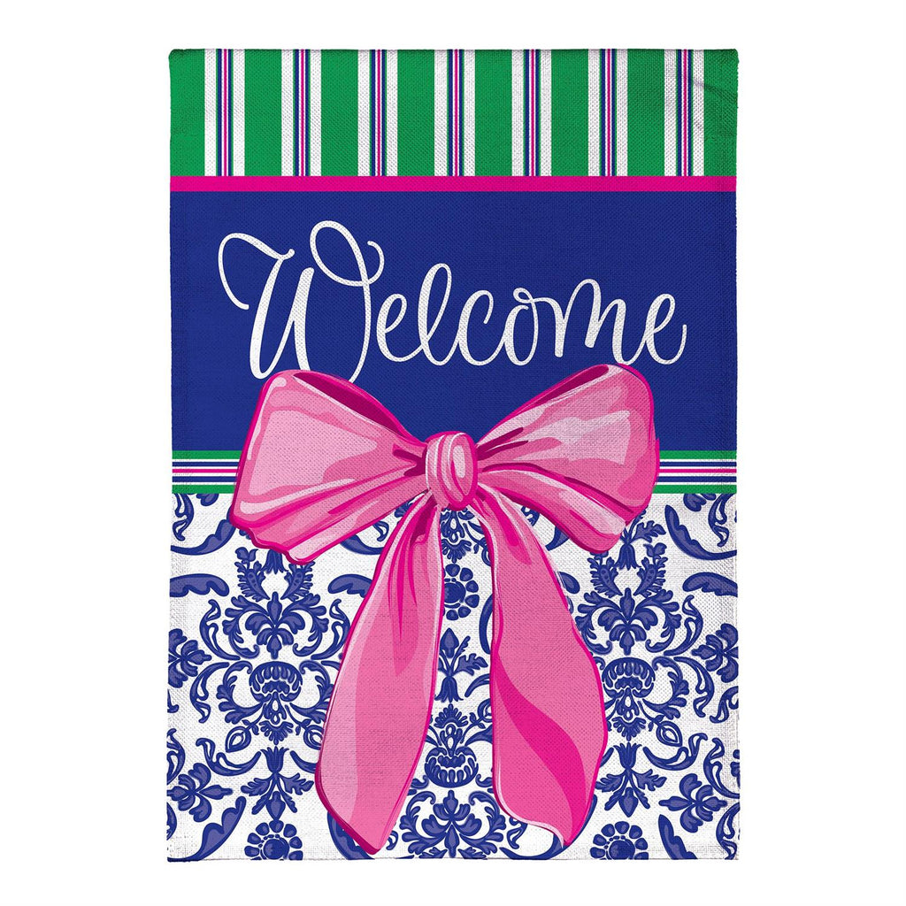 Enhance your home's curb appeal with the Welcome Bow Chinoiserie Burlap House Flag. This elegant flag showcases a vibrant pink bow against a rich blue background, adorned with a classic Chinoiserie pattern. Measuring 44 inches long by 28 inches wide, it’s designed to make a bold statement at your entryway. Crafted from durable burlap, it’s perfect for adding a welcoming touch throughout the seasons. Whether greeting guests or adding a decorative flair to your garden, this flag combines style and durability.